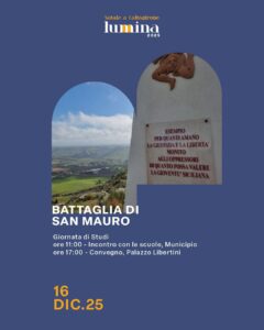 Martedì 16 dicembr si terranno un incontro con le scuole (Salone di Rappresentanza “Mario Scelba” – Palazzo Comunale) e alla Sala Conferenze del Palazzo Libertini il convegno dedicato all’80° anniversario della Battaglia di Colle San Mauro, avvenuta il 29 dicembre 1945, uno degli episodi più significativi e meno conosciuti della stagione del separatismo siciliano, che contribuì al percorso verso l’Autonomia e lo Statuto Siciliano.