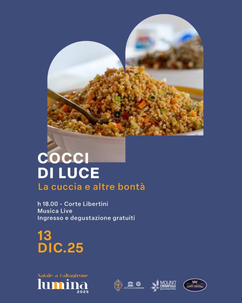 Lumina 2025, il Natale a Caltagirone è anche enogastronomia: sabato 13 dicembre, dalle 18, a Corte Libertini, “Cocci di Luce”, con degustazione gratuita di “cuccìa”, stand con altre specialità natalizie e spettacolo musicale.